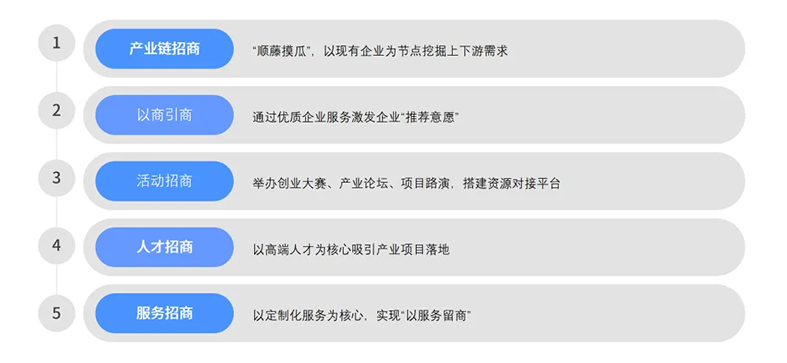 明确方向后,高效的载体建设与招商策略成为将规划蓝图转化为现实图景的关键一步。五大招商路径,为园区招商提供了系统化解决方案: 产业链招商:以龙头企业为核心节点,“顺藤摸瓜” 挖掘上下游配套企业,构建完整产业生态。以商引商:通过优质服务提升入驻企业满意度,激发其主动推荐意愿,实现口碑裂变式招商。活动招商:举办创业大赛、产业论坛、项目路演等活动,搭建资源对接平台,吸引优质项目集聚。人才招商:聚焦高端产业人才,以人才为核心磁场,带动相关产业项目落地生根。服务招商:针对企业个性化需求提供定制化服务,以服务粘性替代单纯政策优惠,实现 “以服务留商”。 化茧成蝶 构建生态,铸就园区核心价值