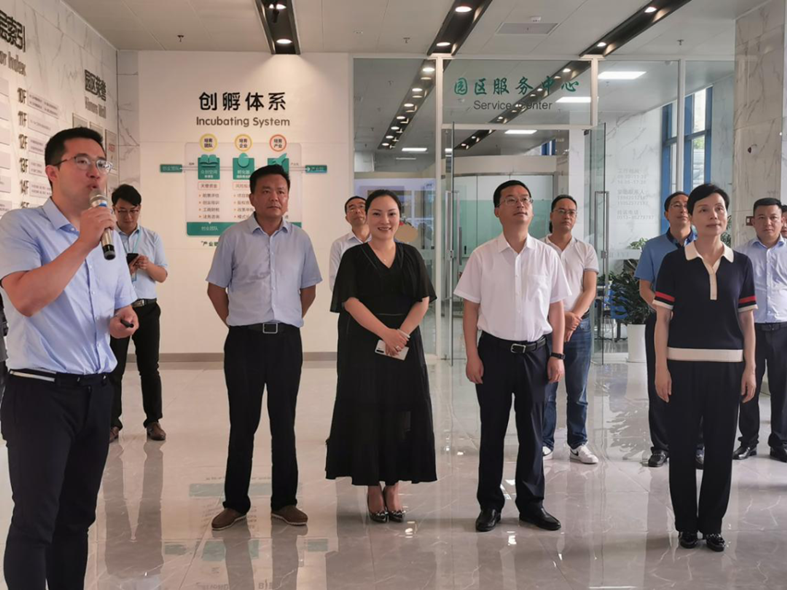 在园区展厅,张椋总经理向李芳书记一行介绍了园区的发展历程、产业服务体系、创孵体系及运营成果。期间,袁珉芝董事长着重向李芳书记汇报了园区在营商环境构建、优质企业招引等方面的工作经验及成绩。