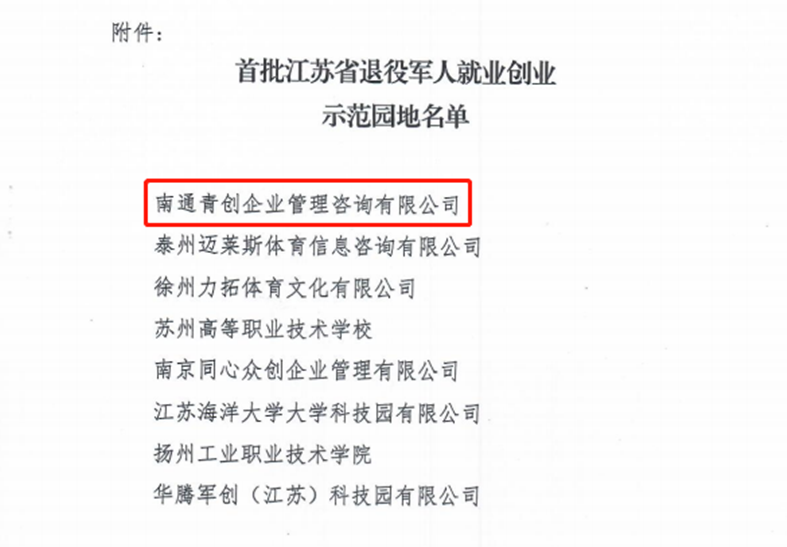 根据《关于确定首批江苏省退役军人就业创业示范园地的通知》(苏退役军人业〔2021〕10号),经初审、复审和综合评定等环节,南通青创企业管理咨询有限公司荣获“首批江苏省退役军人就业创业示范园地”。