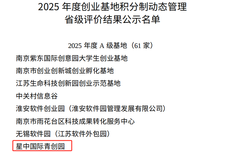 对标攻坚显成效,青创园区树标杆 2025,南通星中国际青创园完成华丽转身, 数字经济为核、文创亮色为缀、优质服务为基。 “四上”企业崭露头角,产学研合作落地生根, 科技型中小企业破土而出,高新技术企业再攀高峰, 区级孵化器绩效评价获评优秀, 部级科技型企业孵化器提名在列, 江苏省人社A级创业基地, 南通市科技服务业集聚区,