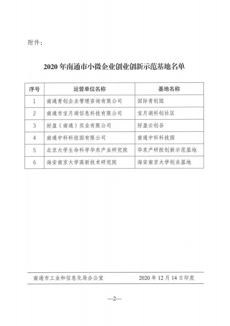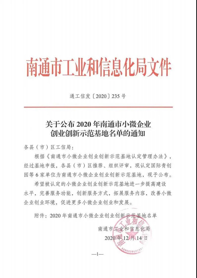 | 国际青创园荣获2020年南通市小微企业创业创新示范基地 | |